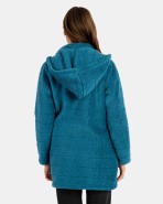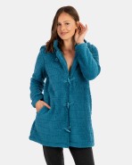 Bata de dona curta amb tanca de botons tipus trenca en teixit tipus borreguet molt suau amb efecte encoixinat. Amb caputxa desmuntable i dues butxaques laterals.
