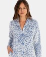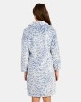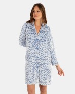 Bata de dona llarga amb tanca de botons en teixit tipus polar molt suau amb estampat 'all over' animal print i efecte 'burn'. Coll solapa i dues butxaques laterals.
