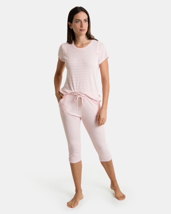 Pantalons pirates en teixit llis rosa de canalé que compta amb cordó ajustable i dues butxaques laterals.