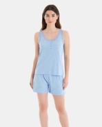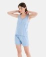 Pijama de dona en teixit de punt cotó - modal estampat, composta per samarreta sense mànigues amb detall de blonda llencera en cises i escot, i pantalons curts en teixit estampat amb goma