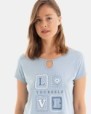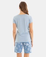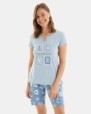 Pijama de dona en teixit de punt cotó - modal, composta per samarreta amb mànigues, amb estampat posicional al pit, escot rodó amb detall de llàgrima i pantalons bermuda en teixit estampat amb goma a la cintura