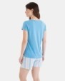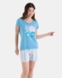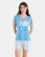 Pijama de dona en teixit de punt cotó llis, composta per samarreta amb mànigues, estampat posicional al pit, escot rodó, obertures en baix lateral i pantalons curts en teixit estampat i goma en cintura contrastada