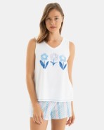 Pijama de dona en teixit de punt cotó llis, composta per samarreta sense mànigues, estampat posicional al pit, escot rodó, i pantalons curts en teixit estampat i goma a cintura