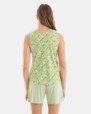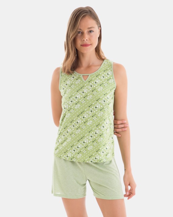 Pijama de dona en teixit de punt estampat, composta per samarreta sense mànigues, escot rodó amb detall en "V" i pantalons curts en teixit llis amb goma a la cintura