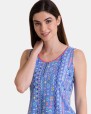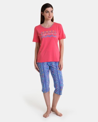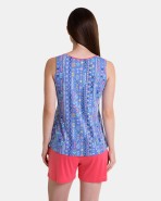 Pijama de dona en teixit de punt molt suau de cotó i modal, compost per samarreta sense mànigues teixit estampat tipus ètnic amb coll rodó. Pantalons curts llis en color coral igual que la tira del coll.