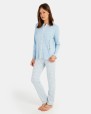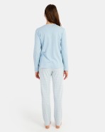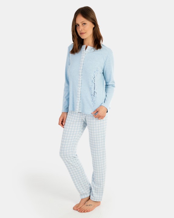Pijama de dona, compost per samarreta de teixit Interlock llis amb estampació posicional al davanter amb tapeta de botons i coll en contrast de quadres, màniga llarga. Pantalons llargs teixit Jacquard de quadres amb goma a la cintura