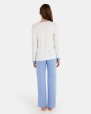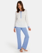 Pijama de dona, compost per samarreta de teixit punt llis de bambú amb estampació all over, tapeta de 5 botons, punys i coll de contrast, màniga llarga i coll rodó. Pantalons llargs teixit llis de bambú amb goma a la cintura