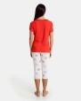 Pijama de dona en teixit viscosa de bambú molt transpirable i suau, compost per samarreta de màniga curta en color vermell amb estampat gràfic central i de coll rodó amb detall de tira cosida acabat en "V", pantalons pirata en teixit estampat de cors amb goma ajustable a la cintura.