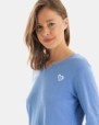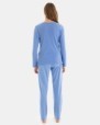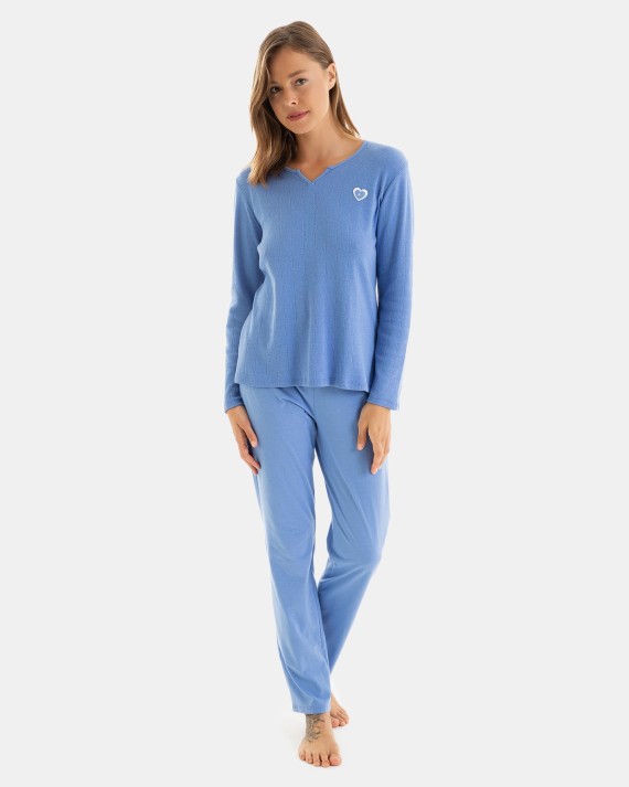 Pijama de dona en teixit de punt cotó llis calat, composta per samarreta amb mànigues llargues, escot rodó amb detall en "V", i pantalons llargs bàsics en teixit llis i goma en cintura