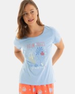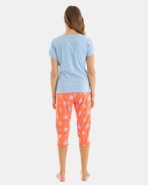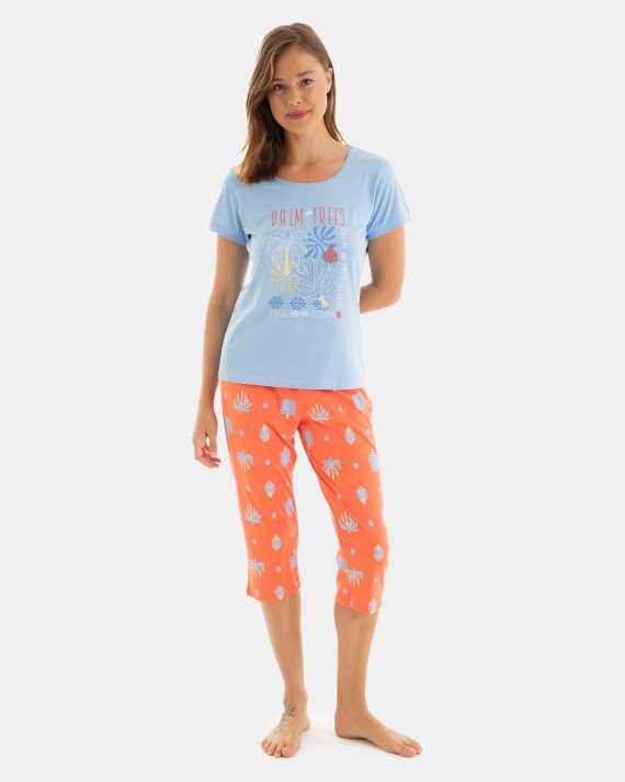 Pijama de dona en teixit de punt cotó - modal, composta per samarreta amb mànigues amb detall de ris en punys, estampat posicional a davanter, escot rodó i pantalons pirata en teixit estampat amb goma