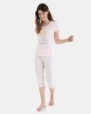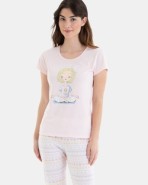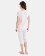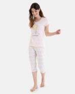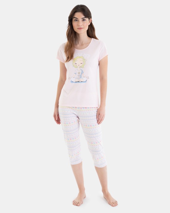 Pijama de dona en teixit de punt cotó llis, composta per samarreta amb mànigues, estampat posicional al pit, escot rodó, i pantalons pirata en teixit estampat i goma a la cintura