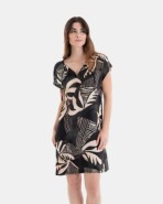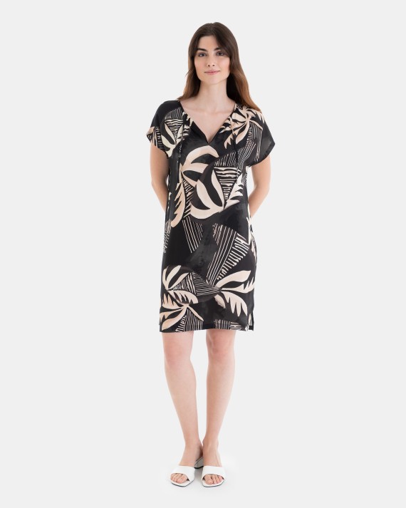 Vestit de dona llarg en teixit de viscosa plana estampat, d'espatlla caiguda, escot en "V" i obertures a baix laterals