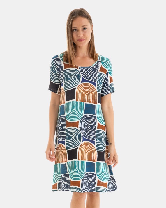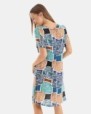 Vestit de dona de teixit plana viscosa estampat, amb màniga i escot rodó a davanter en "V" a l'esquena