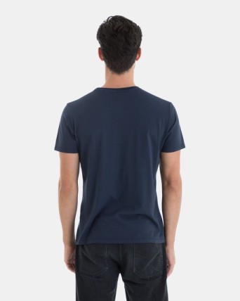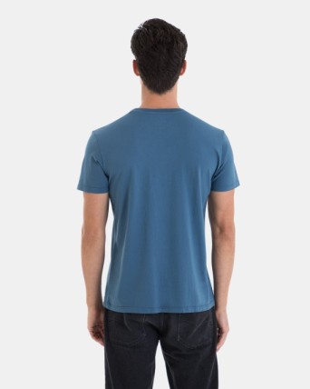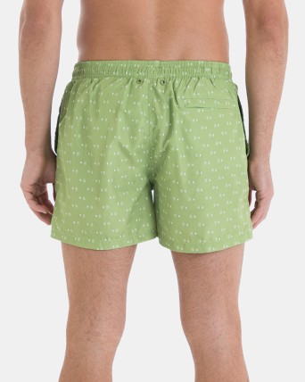 Banyador home en teixit llis color denim amb cintura contrastada. Té dues butxaques laterals i una darrere amb tancament cremallera i goma elàstica ajustable amb cordó.
