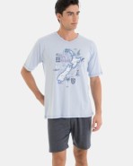 Pijama home en teixit de punt molt suau i transpirable de barreja cotó i modal, compost per samarreta amb estampat gràfic frontal, màniga curta i coll rodó acabat amb tira. Pantalons curts llis amb goma ajustable a la cintura.