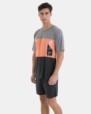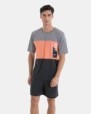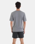 Pijama home en teixit de punt, compost per samarreta de franges contrastades a l'abans, de màniga curta i coll rodó acabat en tira. Pantalons curts llis amb goma ajustable a la cintura.