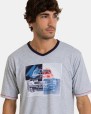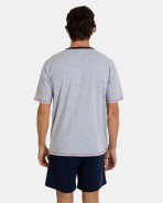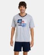 Pijama d'home en teixit de punt, compost per samarreta en fons gris vigoré amb estampat frontal, màniga curta i coll bec. Pantalons curts llis amb goma ajustable a la cintura.