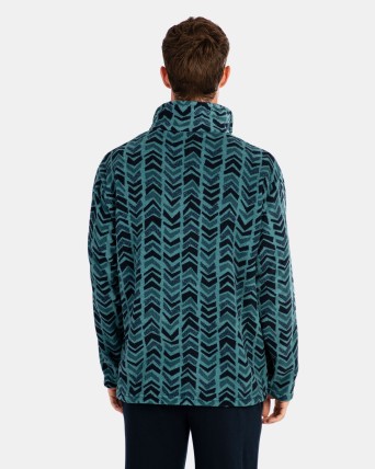Pijama llarg de teixit punt cotó 100%. Compost per samarreta màniga llarga amb estampat all over, coll de bec. Pantalons també en teixit de punt cotó 100% en color blau, acabat amb punys i cordó ajustable a la cintura i amb dues butxaques als laterals.