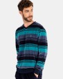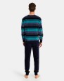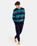 Pijama en teixit de punt gruixut tundosat. Compost per samarreta de ratlles en diferents tonalitats de blau, turquesa i marí amb coll pic, punys i baix de canalé elàstic. Pantalons també en teixit tundosat llis en marí i cordó ajustable a la cintura, acabat en puny, amb dues butxaques als laterals.
