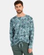 Pijama de teixit de punt cotó 100%. Compost per jaqueta tipus jersei geomètric de color verd, màniga llarga i amb coll tapeta de botons. Pantalons també en teixit de punt cotó 100% acabat amb punys i cordó ajustable a la cintura en color verd, amb dues butxaques als laterals.