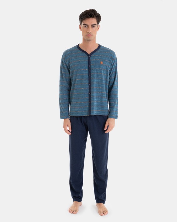 Pijama home en teixit de punt Jacquard, compost per jaqueta oberta de màniga llarga amb tanca de botons i acabada en forma de en "V". Pantalons llargs llis amb goma ajustable a la cintura.