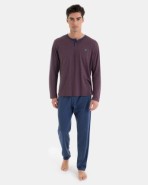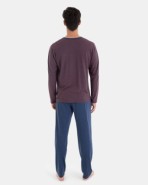 Pijama llarg d'home en teixit de punt micro llistat, samarreta de màniga llarga i coll tapeta que corda amb botons. Pantalons llargs llis i goma a la cintura.
