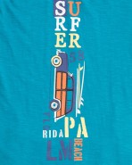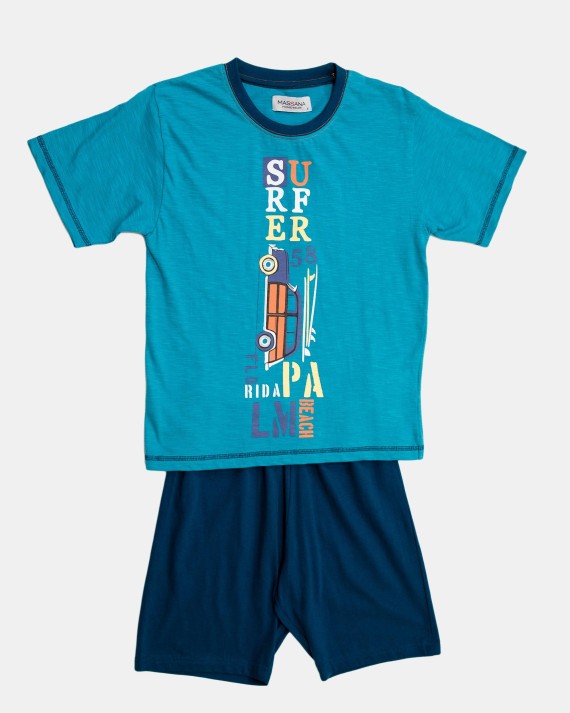 Pijama de nen en teixit fresc de cotó 100%. La samarreta de màniga curta en color blau turquesa de coll rodó amb un viu al to dels pantalons i amb un estampat gràfic al davanter amb motiu de "surf". Els pantalons curts en color blau més fosc.