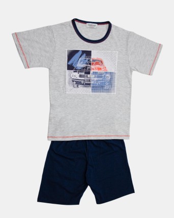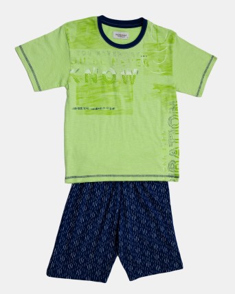 Pijama de nen en teixit molt suau i fresc de cotó i viscosa. La samarreta de fons color groc amb estampat al davanter de motius "surf", el coll rodó amb tira del color dels pantalons. Els pantalons curts en color verd fosc.