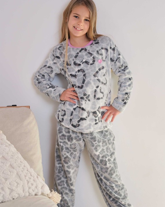 Pijama de nena compost per samarreta de polar estampat, màniga llarga coll amb viu en contrast i tira ajustable a la cintura. Pantalons llargs en polar estampat i goma a la cintura.