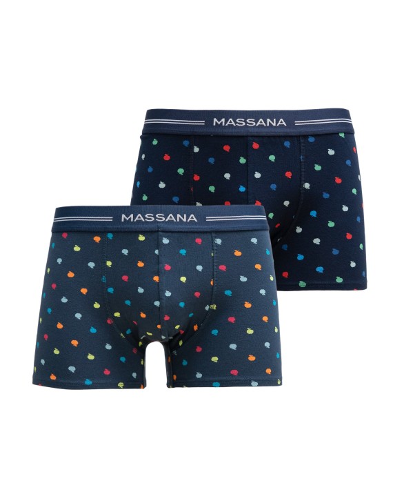 Pack de dos bóxers de punto en tonos azules con estampado de manzanas. Goma elástica de Massana.