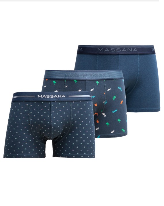 Pack of three knitted boxers in blue that combines two prints and one plain. Massana elastic with a very soft and pleasant touch.