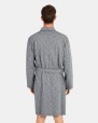 Long knitted robe with a mixed yarn pattern, double-breasted in medium gray, with belt and two pockets with contrasting piping detail on the strip.