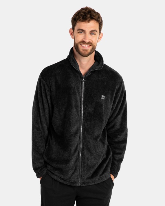 Short robe in grey fleece fabric, with zipper and high collar. Soft and pleasant to the touch. Has two side pockets.