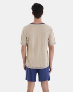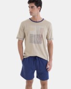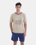 Men's pajama in 100% cotton knit fabric, consisting of a t-shirt with a front graphic print, short sleeves, a round collar, and a contrasting collar strip, with matching pants. Plain shorts with an adjustable waistband and side pockets.