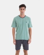 Men's pajama in 100% cotton knit fabric, consisting of a short-sleeve t-shirt with a geometric print, a V-neck collar, and a contrasting collar strip, with matching pants. Plain shorts with an adjustable waistband and side pockets.