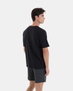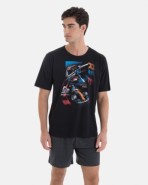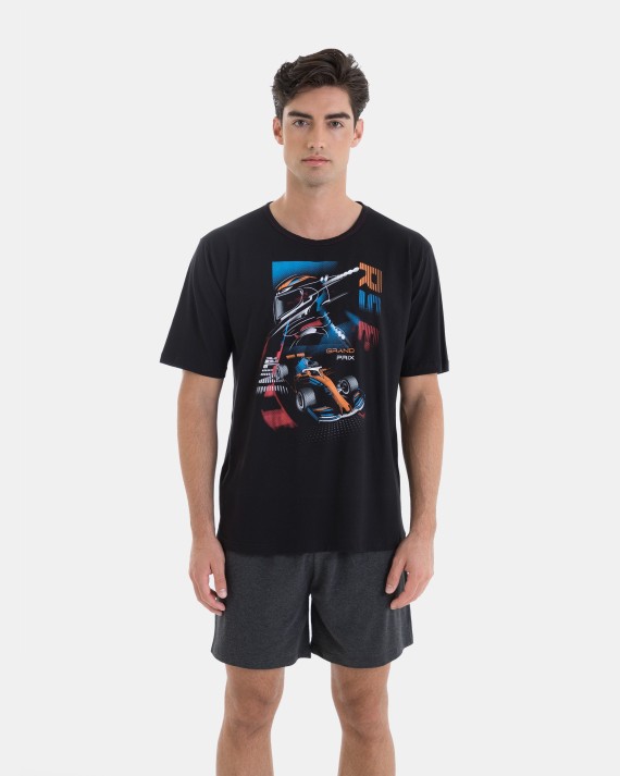 Men’s pajama in knit fabric, consisting of a 100% cotton t-shirt in plain fabric with short sleeves and a round collar. Plain shorts with an adjustable waistband.