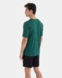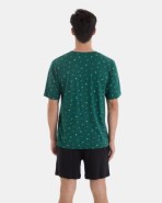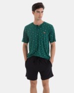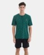 Men’s pajama in a very soft cotton and viscose blend knit fabric, consisting of a multi-print short-sleeve t-shirt with a button-down collar. Plain shorts with an adjustable waistband and side pockets.