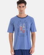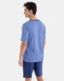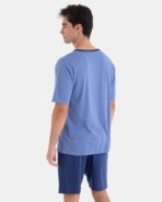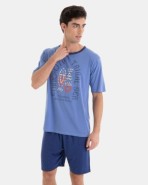 Men’s pajama in a very soft cotton and modal blend knit fabric, consisting of a short-sleeve t-shirt with a Sigui print, a round collar, and a strip. Plain shorts with an adjustable waistband.