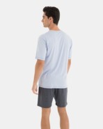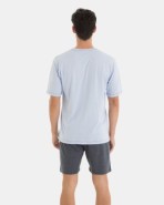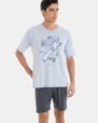 Men's pajama in a very soft and breathable cotton and modal blend knit fabric, consisting of a short-sleeve t-shirt with a front graphic print, a round collar finished with a strip. Plain shorts with an adjustable waistband.