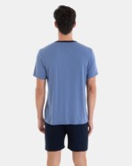 Men's pajama in very soft and breathable bamboo knit fabric, consisting of a short-sleeve t-shirt with a kayak print, a V-neck collar finished with a strip. Plain shorts with an adjustable waistband.
