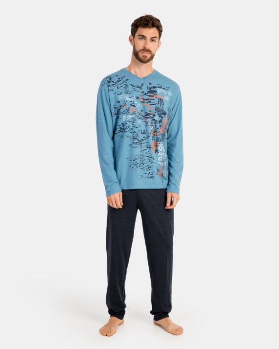 Knitted pajamas. Composed of a 100% piece-dyed cotton jacket, long sleeves in blue, a V-neck and a positioned print. Trousers in knitted fabric with suede on the inside, in gray with an elastic waist.