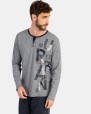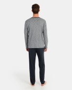 Knitted pajamas. Composed of a long-sleeved blue jacket with a positioned print, a button-down collar. Blue knitted pants with a suede interior and an elastic waistband.