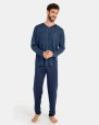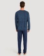 Modal knit pajamas. Composed of a jacket with a micro dot print and a V-neck. Plain blue pants with an elastic waist.