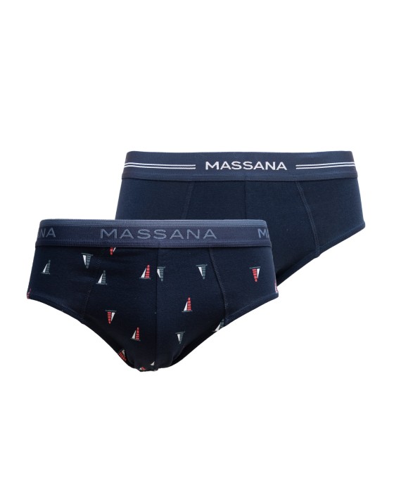 Pack of two knitted briefs in blue that combines a boat print and a plain one. Massana elastic with a very soft and pleasant touch.