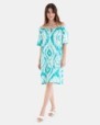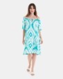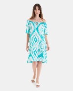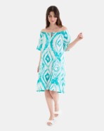 Women's dress in plain viscose fabric, with elastic at the neckline, which can be lowered to a collar, and sleeves to the elbow.