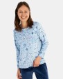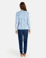 Women's pyjamas in microfleece fabric, consisting of a long-sleeved T-shirt with a round neck, with an all-over fantasy print. Plain navy collar. Plain navy straight trousers with cuffs. Has an elastic waistband.