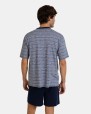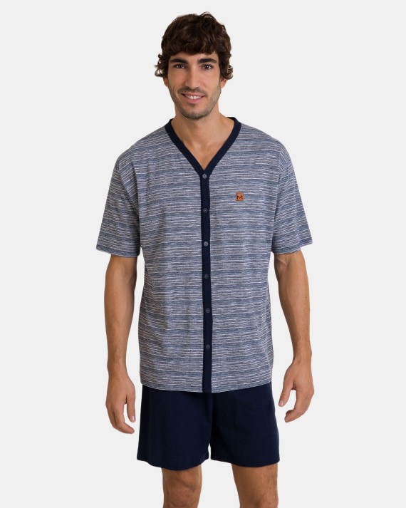 Pijama de hombre en tejido de punto Jacquard de dibujo rayado horizontal en mezcla de hilos , compuesto por camiseta manga corta y cuello pico abierta que abrocha con botones. Pantalón corto de tejido liso en color marino con goma ajustable en la cintura.