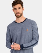 Pijama en tejido de punto. Compuesto por chaqueta en tejido listado en tonos azules, manga larga y cuello redondo. Pantalón también en tejido de punto acabado con puños y goma en la cintura.