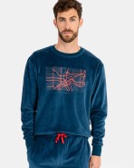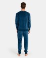 Pijama en tejido de punto grueso tundosado. Compuesto por camiseta en color azul, estampado centrado y puños y bajo de canalé elástico. Pantalón también en tejido tundosado liso en azul y cordón ajustable en la cintura, acabado en puño, con dos bolsillo en los laterales.
