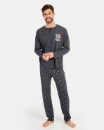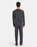 Pijama en tejido de punto. Compuesto de chaqueta manga larga de color gris gamuzada por dentro, en cuello tapeta con estampado posicionado. Pantalón en tejido de punto gamuzado por dentro, en color gris estampado all over con cinturilla elástica.